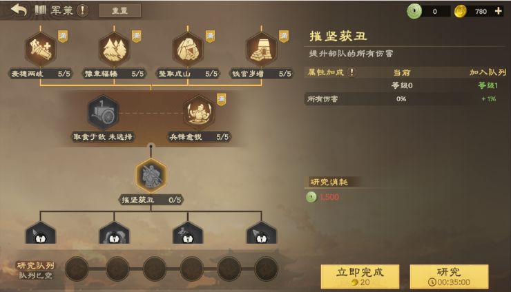 ● 军策研究时间较短(5分钟-10小时),可请求盟友协助,不可使用加速政令,但可消耗20金铢立即完成。