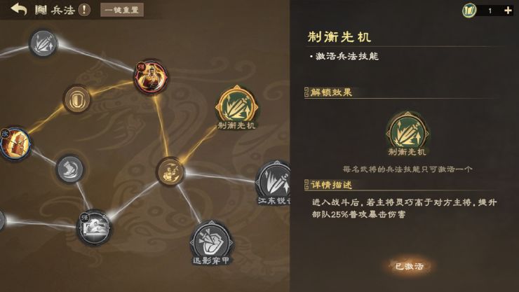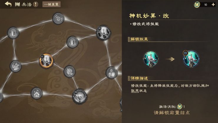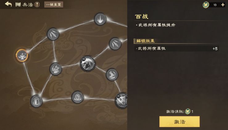 ● 兵法需要按路径逐个解锁,多条路径可选,每个武将每天至多可重置3次兵法。