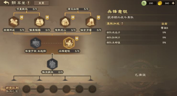 兵锋愈锐:提升士兵三维,满级后可增加5%的三维。