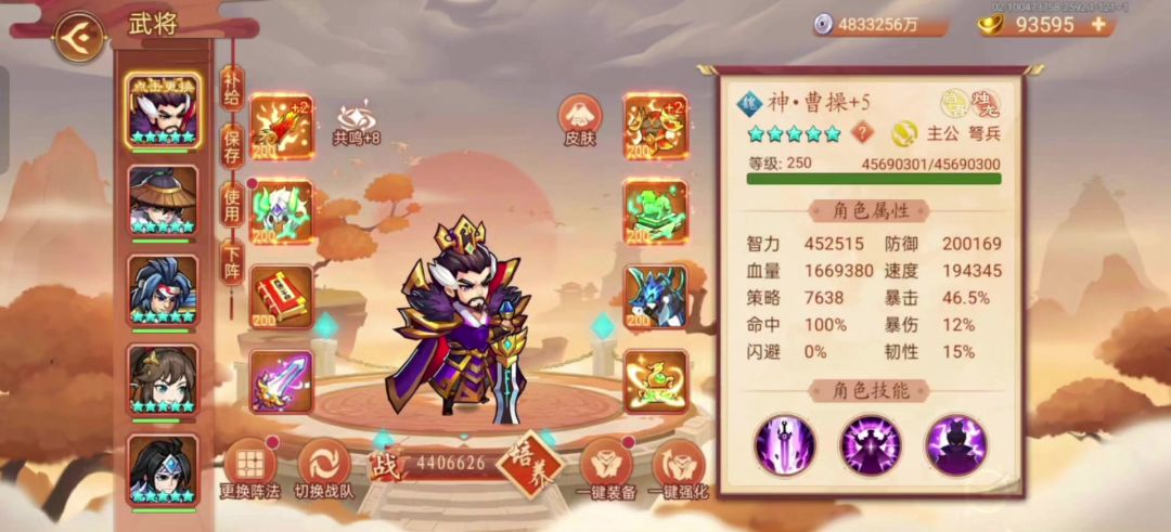 配置自行看,老曹徐庶邓艾身上的洪荒其实可以忽略不计,只要神星彩,速度要求没那么高,上不上洪荒无所谓。输出身上两件洪荒可能有点影响,但是没办法我只有洪荒枪印有橙色的备战。过关要点:先杀吕布!先杀吕布!先杀吕布。老曹香香的武器要橙色狂战,这很重要。香香邓艾的印要带橙色备战。至于头盔带什么,自己根据自己装备配置决定就好。【如果有启灵太虚给邓艾穿,其实容错会增加很多。另外打神鞭还没到满级,容错也还有,只是星彩刷需要点运气和局内操作,个人建议辛妹最好】