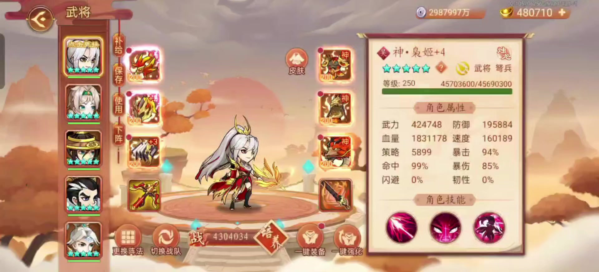 过关阵容二:仙辛妹【装备随便带,神器带了个橙色葫芦凑一下数,然后主要是速度需要在套盾之后超速对面仙赵,最好是在徐庶老曹速度之后,会提高局内容错】+仙徐庶(19万速可以超速,在这里带伏羲琴,有神星彩其实18万左右应该可以)+神曹操(没啥好说的,速度超过对面仙赵,带圣崆峒就行。注意面板命中!!!)+十觉星彩(启灵鞋子,装备随意)+神枭姬(这套阵容的枭姬一定是可以用凤翔六件套打的,视频内用了烛龙枪头凑数,原因是因为我凤翔枪没有狂战。)