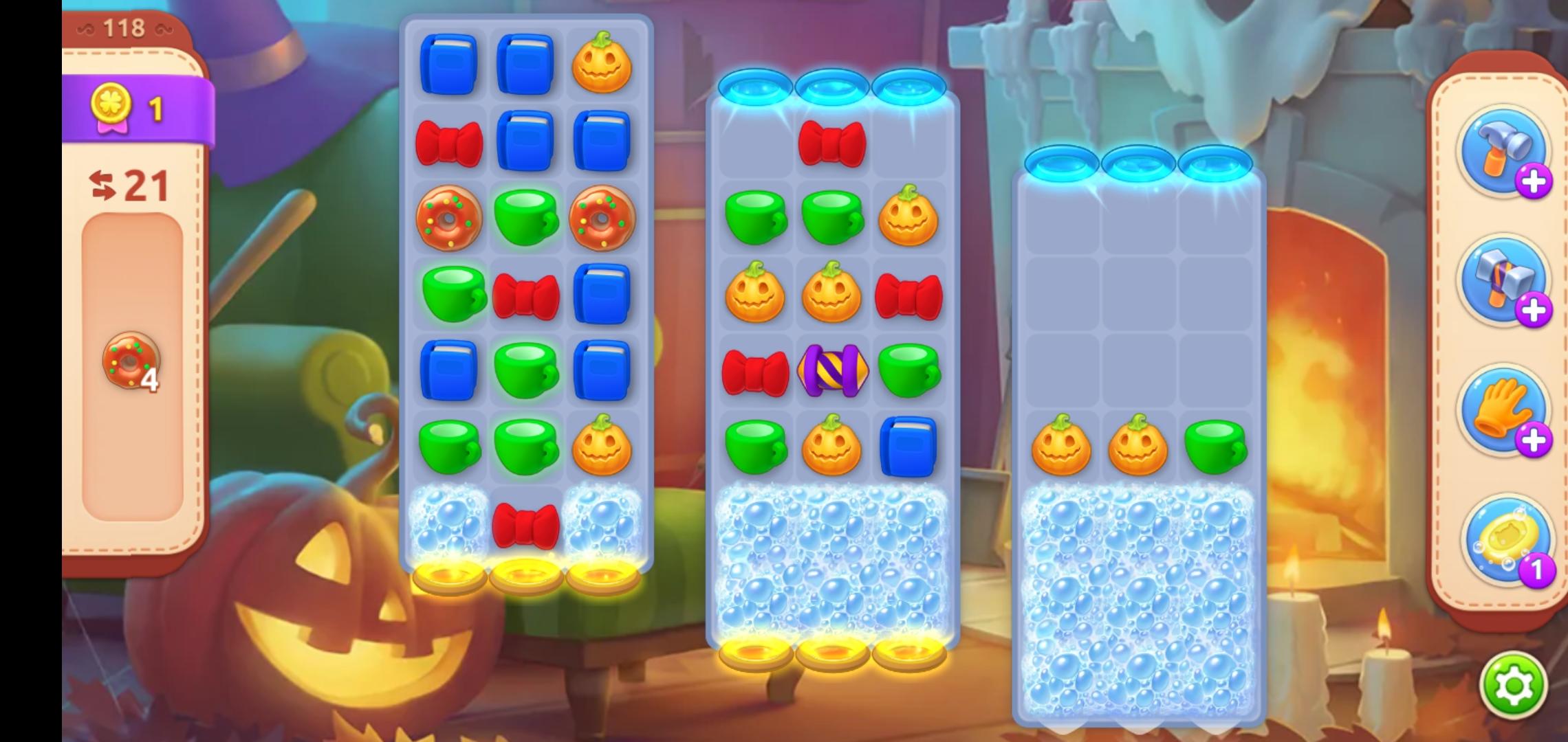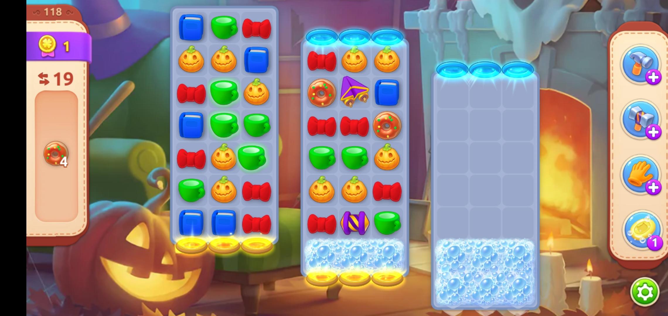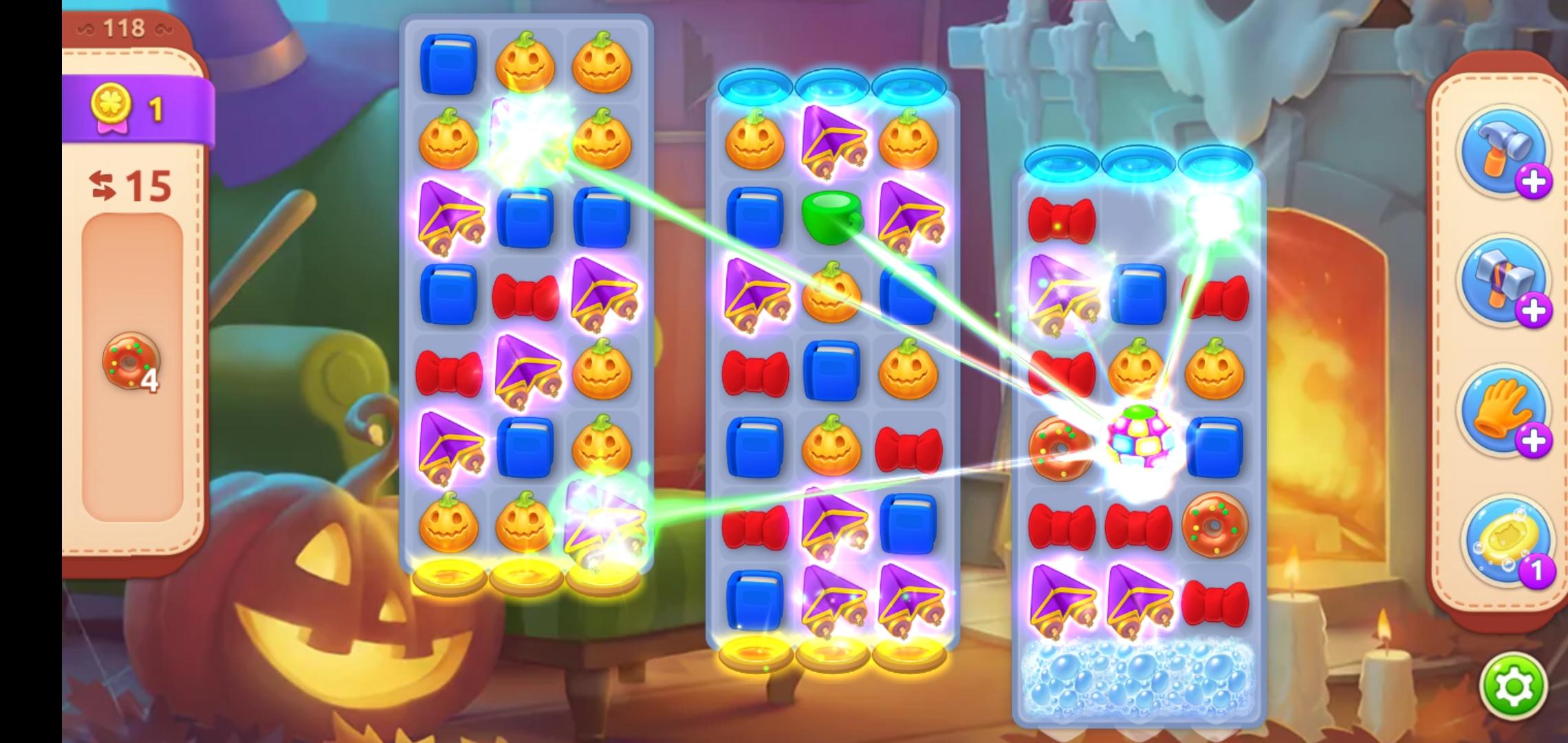 第二场景的泡沫还剩最后一排,同样用横向火箭🚀炸开,这样一来,第三场景也只剩一排泡沫了,同时,甜甜圈也来到了第三场景