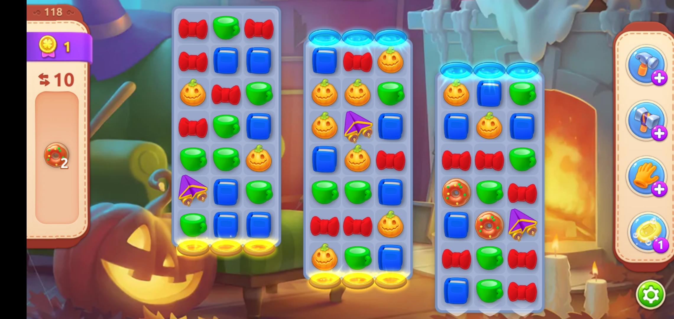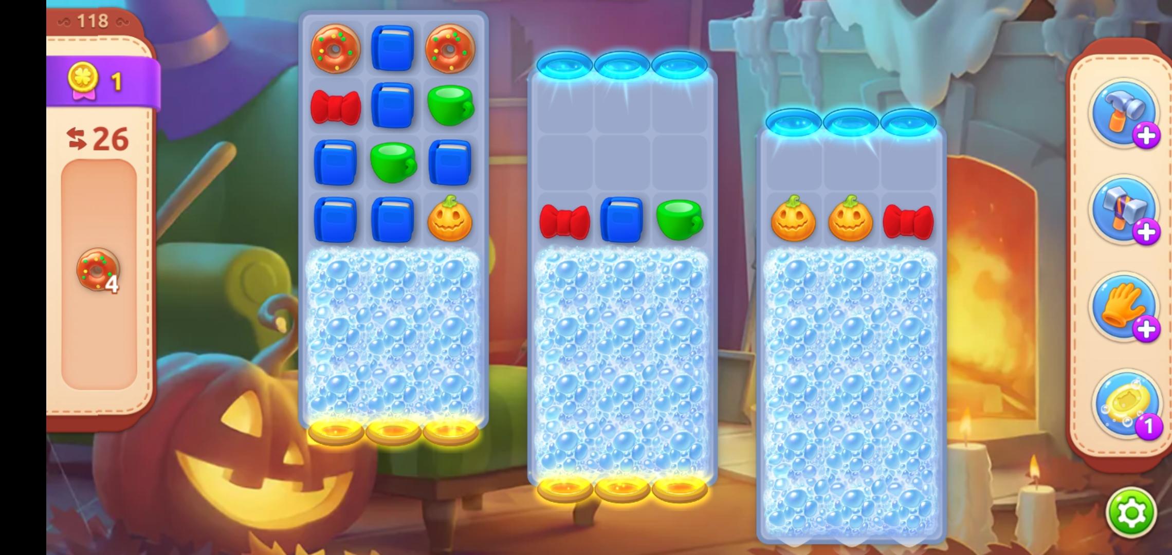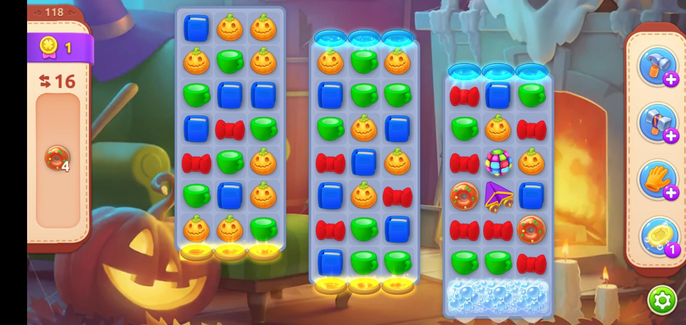 第二场景的泡沫还剩最后一排,同样用横向火箭🚀炸开,这样一来,第三场景也只剩一排泡沫了,同时,甜甜圈也来到了第三场景