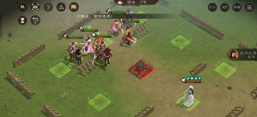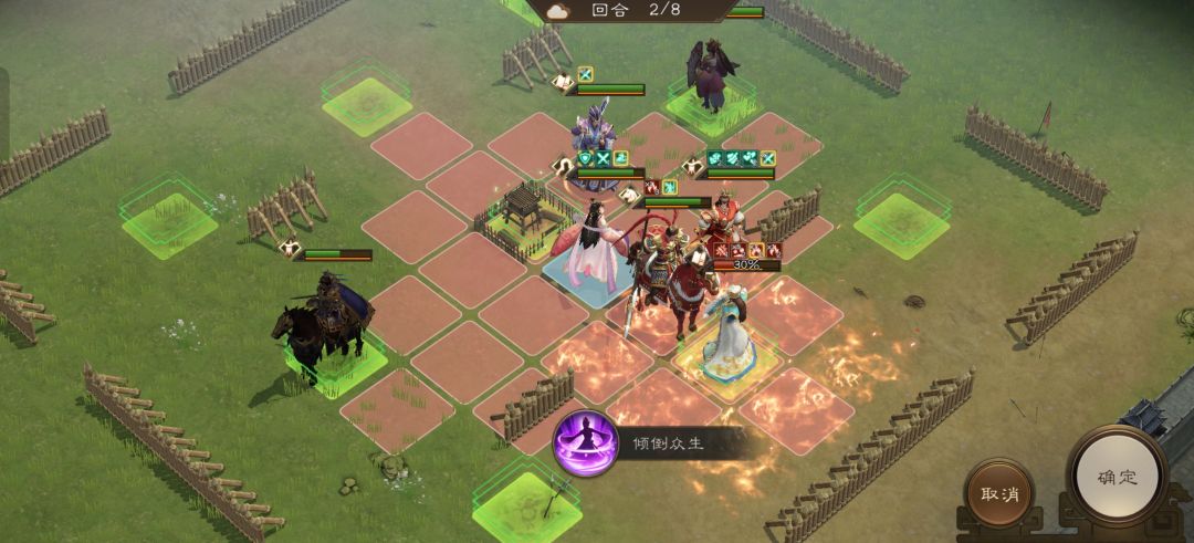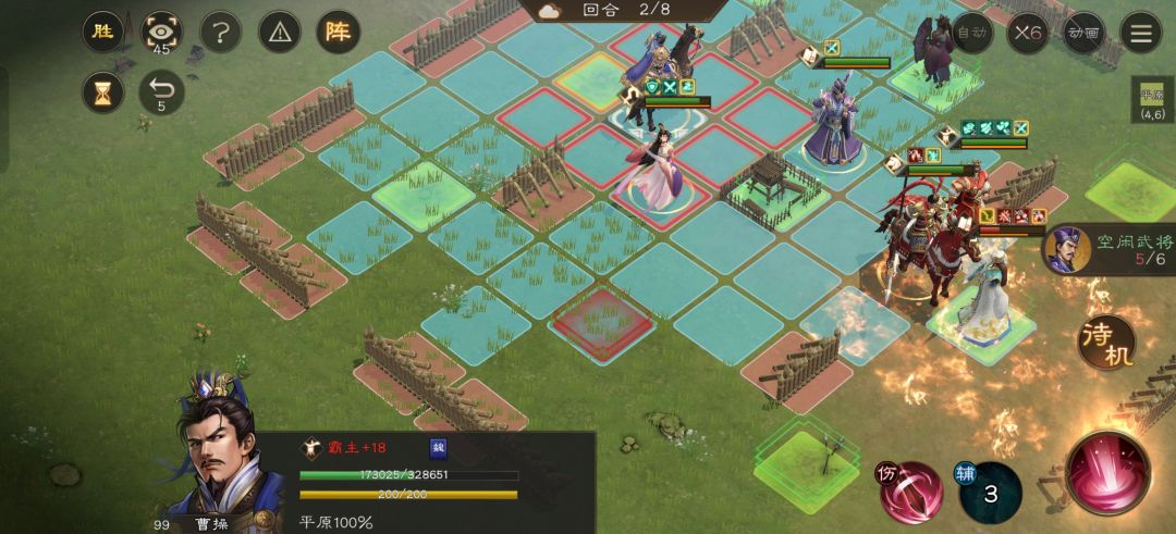 第一回合曹操走到我方中间开辅助技能,小乔开辅助,吕布上前踩到红色方格后变为绿色,貂蝉再动吕布,吕布、周瑜、李儒开技能攻击诸葛亮。