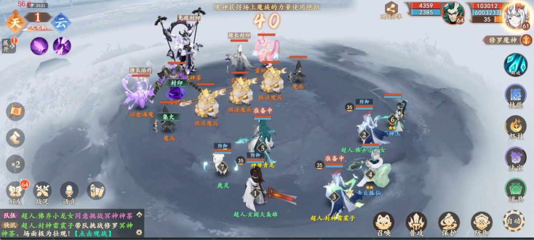 2、直接集火魔神,尽快杀死即可,如果2回合无法击杀主怪,药师需要喝酒在第三回合放一次大招(生死结界),规避伤害(务必确保好怒气,这个主怪魔咒可能会随机减怒)