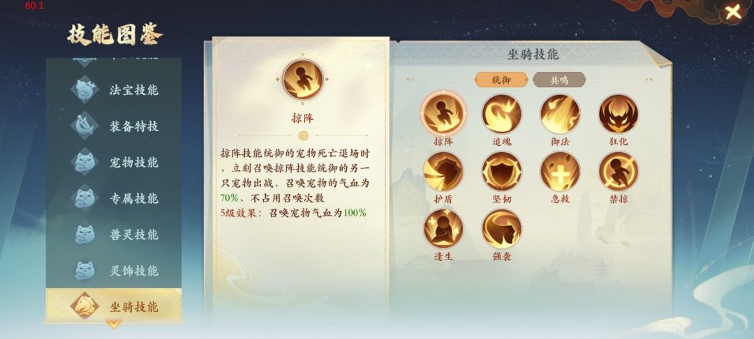 坐骑技能:解锁技能后,可以选择宠物进行统御,对应宠物将获得该技能效果,具体技能说明可进入坐骑-坐骑技能页面查询。天命之人可使用【万灵果】对坐骑进行升级来解锁更多坐骑技能。