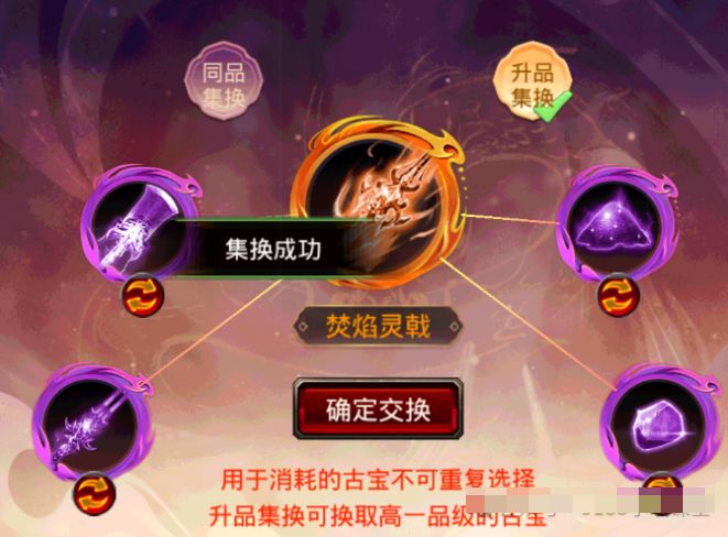 A7:不是,可以在【古宝集换】玩法当中,在地级古宝中选择【升品集换】来换取,用4个紫色的地级古宝交换1件未满星的橙色古宝。