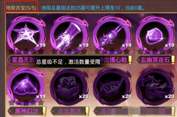 A9:如图所示,默认只能激活5个古宝,需要提升古宝的总星级且达到一定的要求,才能够增加古宝可激活的上限。比如只能激活5个,那么我这5个古宝全部升到5星,总等级就达到了25星,此时可激活上限提升至10,以此类推。