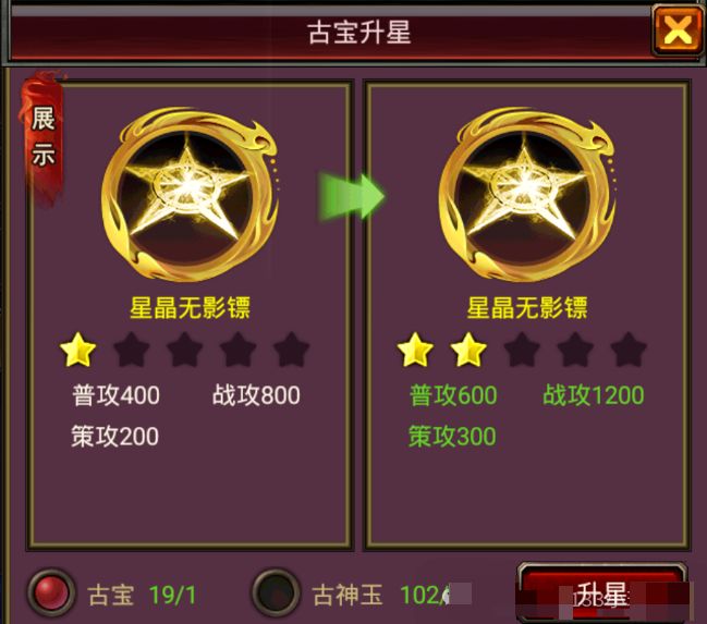 A4:消耗相同品质相同星级的古宝可以提升古宝星级。升星可以获得更高的古宝属性。