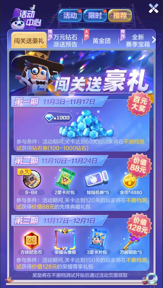 11月3日-17日,所有关卡达到60关的方块超人即可获得不删档测试钻石卷;11月10日-24日,登录游戏且关卡达到120关,还可额外获得“8bit”音乐包及道具礼包!11月17日-12月1日,登录游戏且关卡达到150关,还可以获得荣耀头像框、3星卡片包及获得助你快人一步,与众不同。