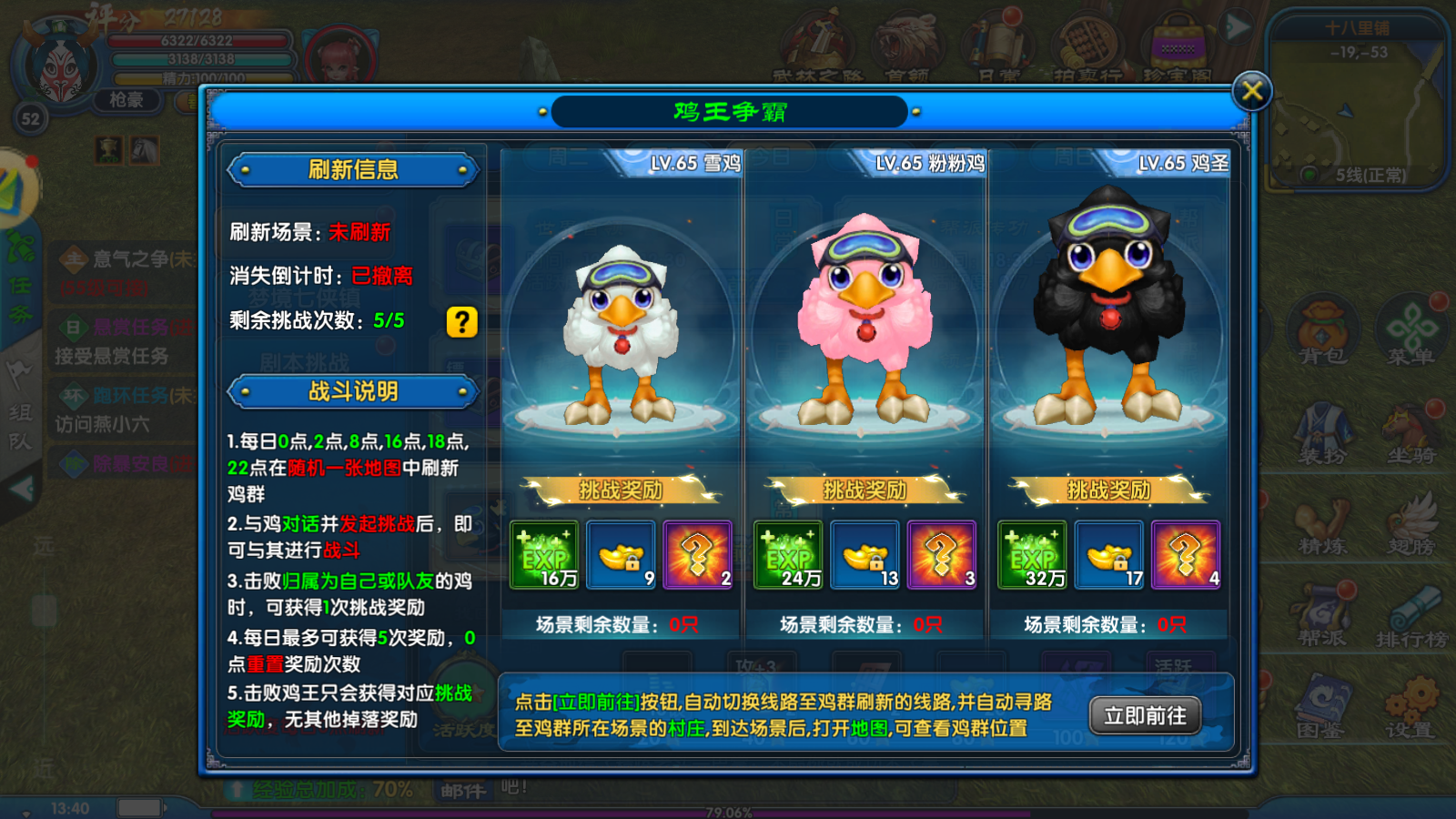 - 参与与奖励:对话鸡王 “发起挑战”,首攻者得归属权(死亡则清空);每日最多获 5 次奖励(0 点重置),组队同屏队友共享奖励,击败得经验、绑元及随机道具(含鸡圣坐骑碎片,40 个可合成传说坐骑)。