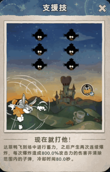 支援技:现在就打他!达菲鸭飞到场中进行蓄力,之后产生两次连续爆炸,每次爆炸造成大量伤害并清除范围内的子弹。