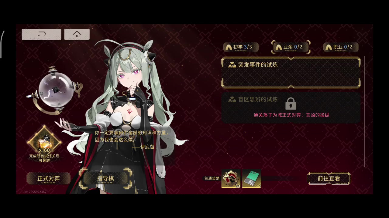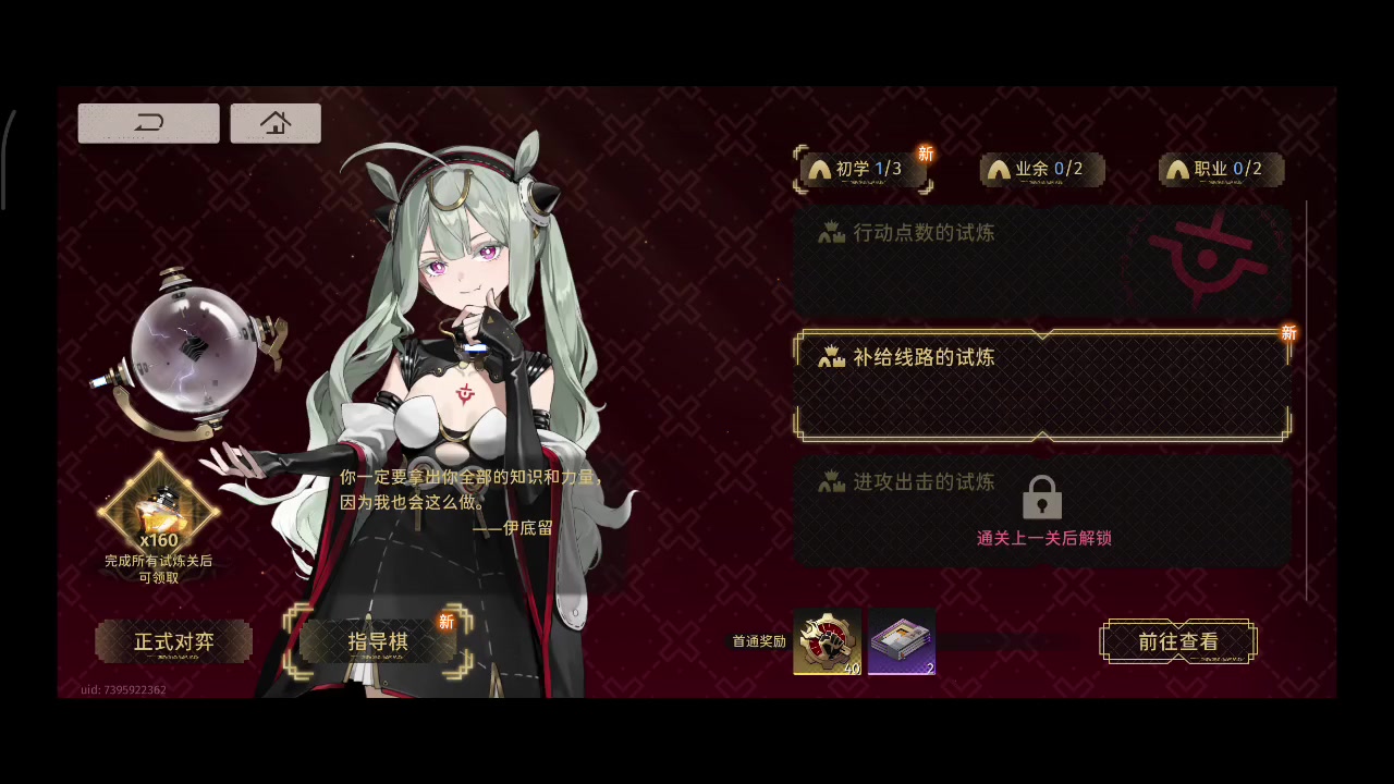 正式对弈第1-3关,这前3关偏简单,且无需配队,可以说是教学局,建议自行体验一下。而其他关卡需要自己配队了,需要培养好角色。对新手不太友好,因为需要配好几个队,不然体验不佳,可以找大佬借角色
