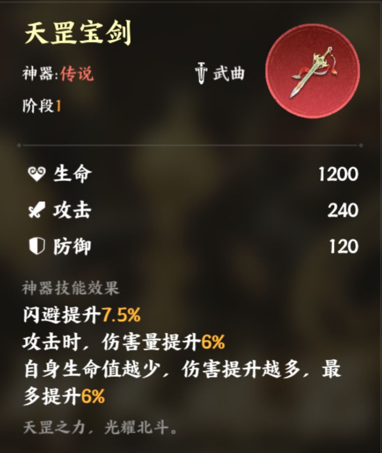 1)天罡宝剑:提升闪避率从而提高反击概率,增加残血时的输出能力