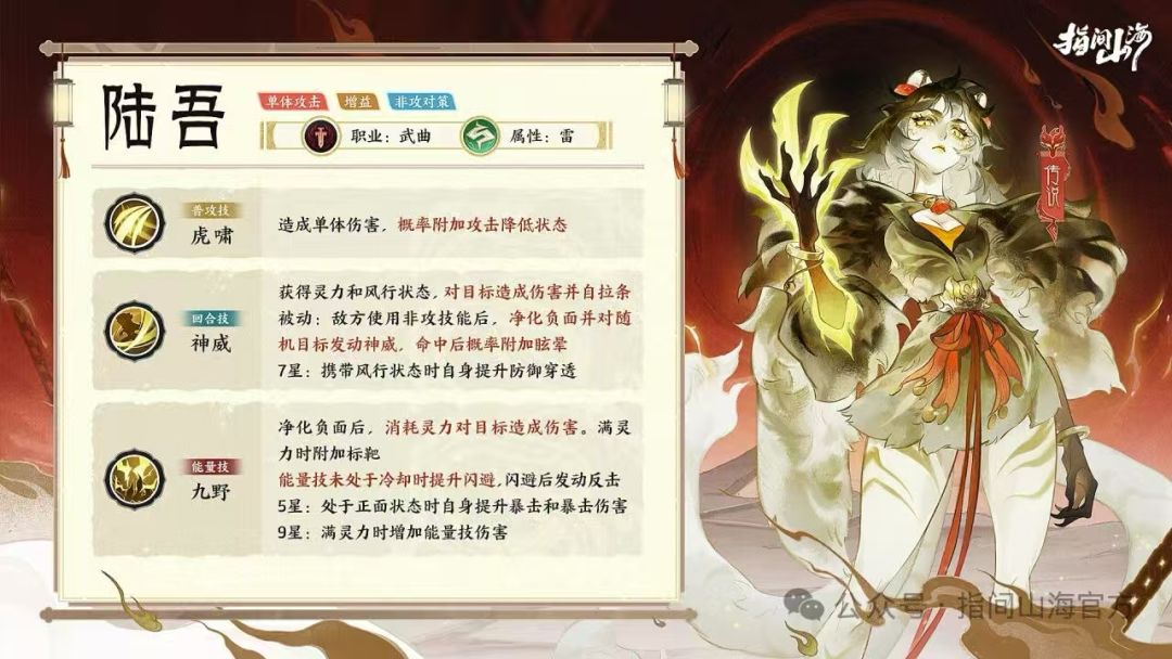 1)陆吾是一个十分综合的单体输出,有闪避、有反击、有穿透、有加攻击和速度、有回血、有降攻等等,如果阵容缺少单体输出可以优先抽取