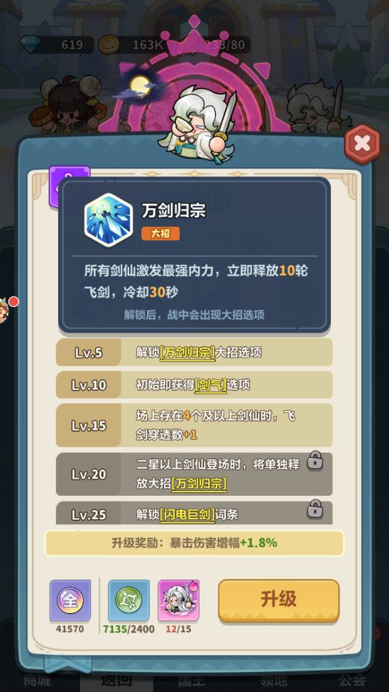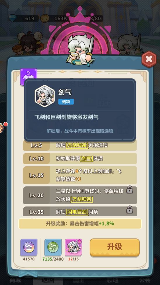 5级:可解锁“万剑归宗”大招选项,此时培养“剑气强悍(强化180)”等词条,剑仙已能有不错表现。