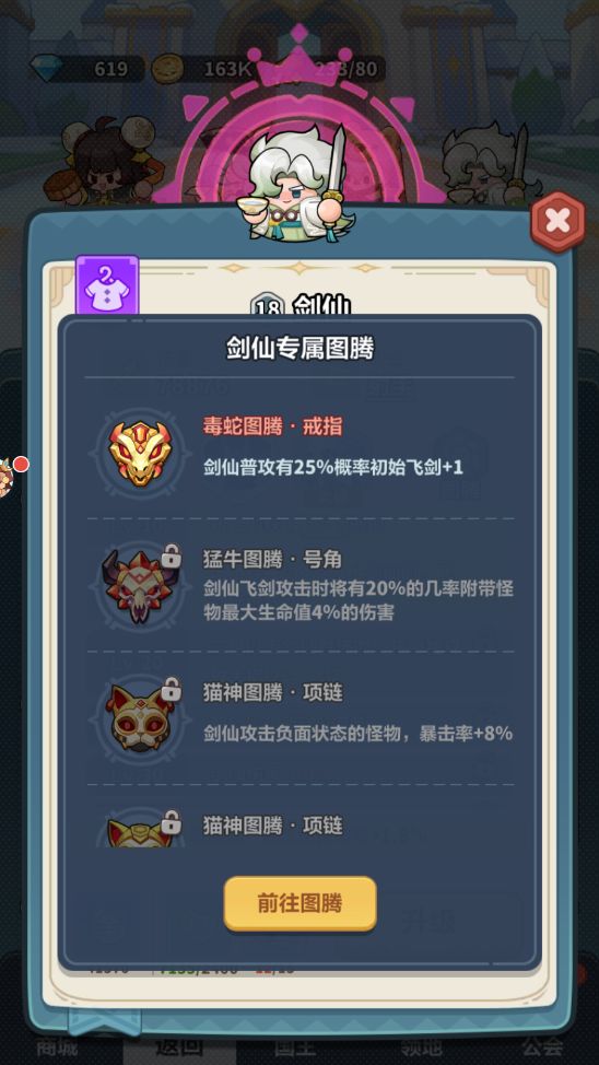 核心图腾(看运气):牛角部位提供百分比伤害的图腾,若获取,15级剑仙即可应对彩虹4层;若未获取,20级剑仙应对彩虹4层也易翻车,但即使没有也不影响整体玩法核心构建。