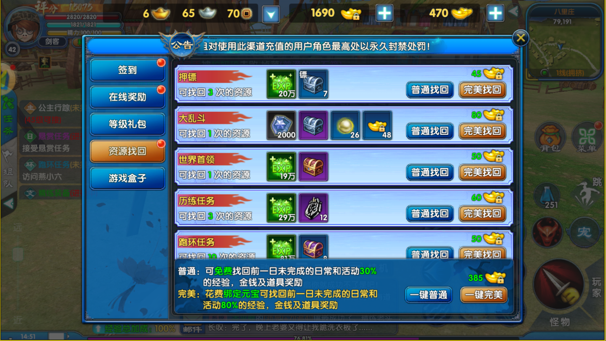 精力的核心作用是为刷怪与任务提供额外收益,拥有精力时击败怪物可获得远超无精力状态的经验,且每击杀固定数量怪物消耗 1 点精力,怪物等级越高,1 点精力转化的额外经验越多。精力补充依赖初级、中级、高级三类精力丹,分别恢复 1 点、10 点及更多精力,可按需选择避免浪费。