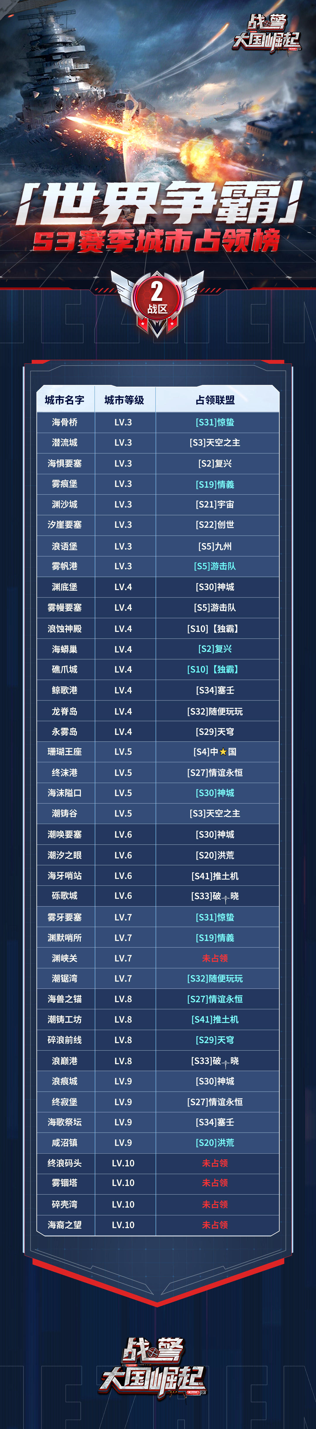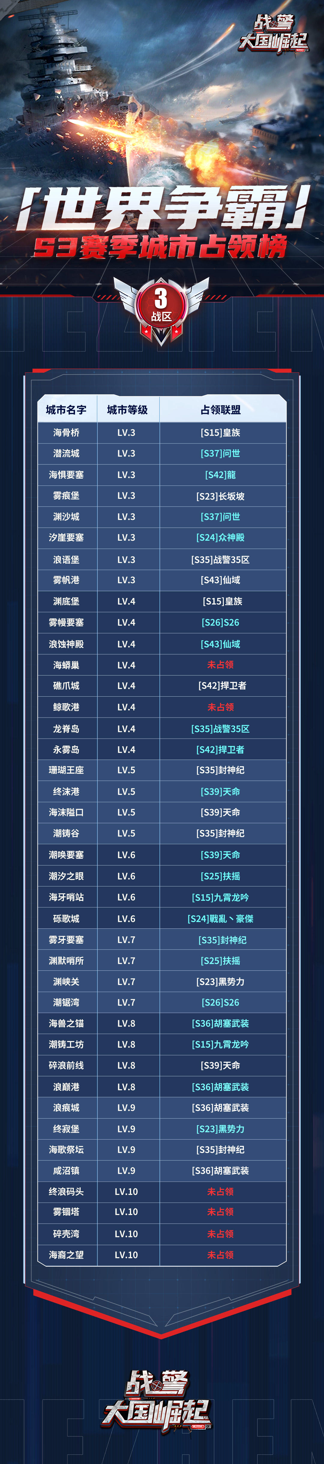 【海上速报】S3赛季第四周世界争霸城市占领榜