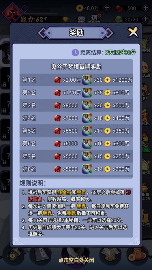 若历史最佳成绩大于等于20关,则后续进入鬼谷子梦境时可以择跳关(跳关的关卡数为本期最高关卡数-10关)