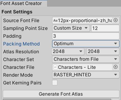 - 最后在TextMeshPro用第一步做的字符表生成Font Asset (花了15分钟。。);(1024x1024好像完全放不下。。padding我看有人提到最好不要低于point size的10~30%就没选太小):