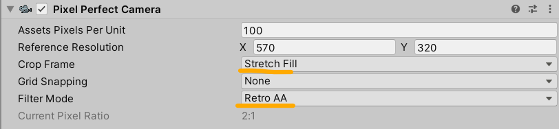 - 如果一定想要任意倍数缩放,可以调整pixel perfect camera的设置;以一定清晰度为代价来实现(非整数倍会有点糊,但其实不太容易看出来-.-)