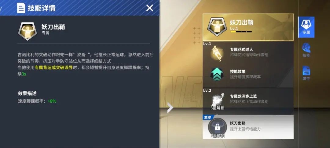 ● 吉诺比利的专属技能:妖刀出鞘!自带专属欧洲步上篮和花式过人!