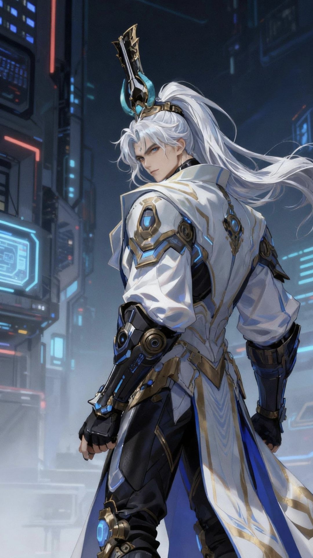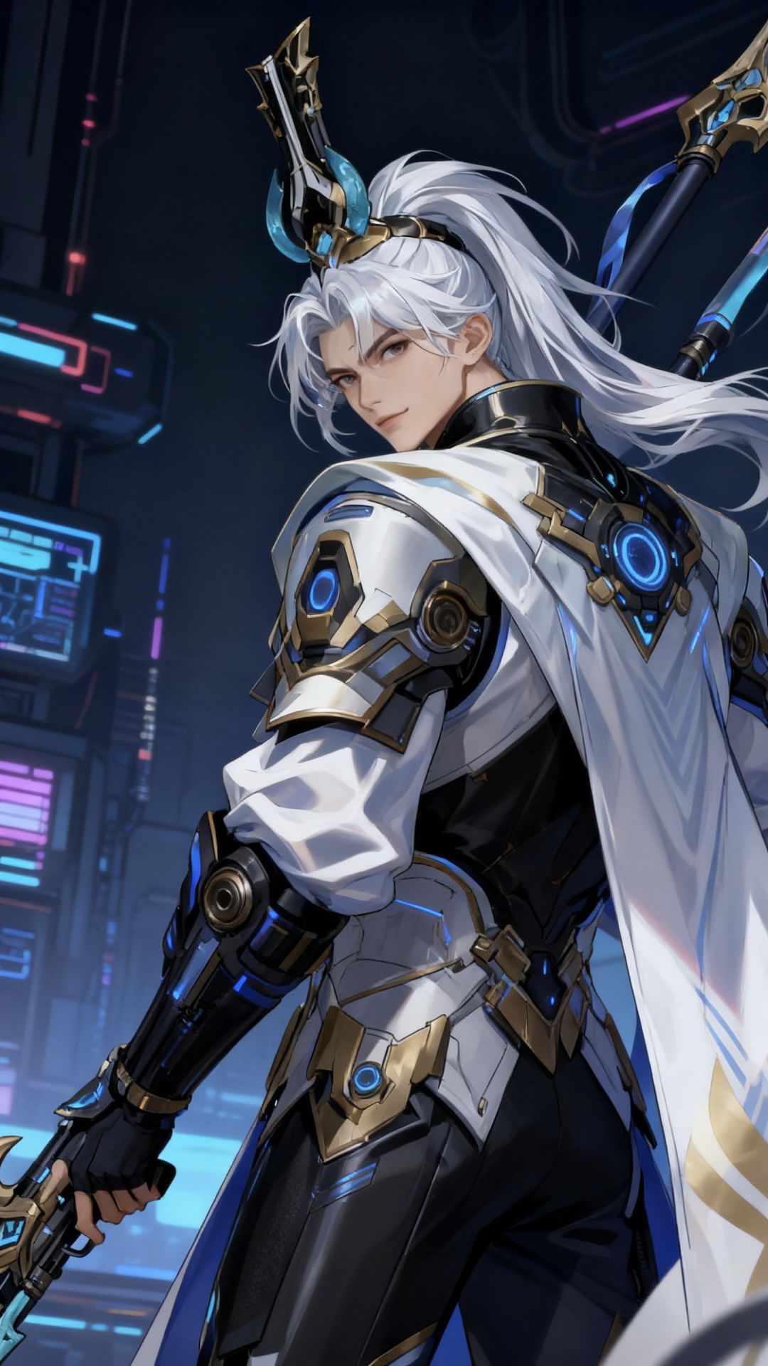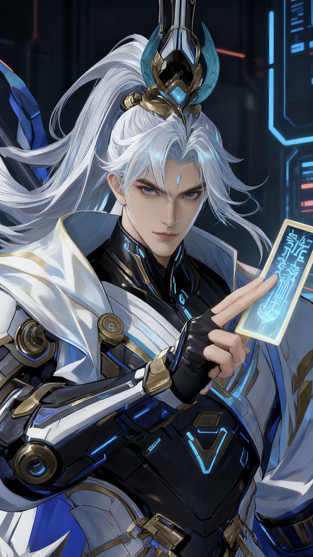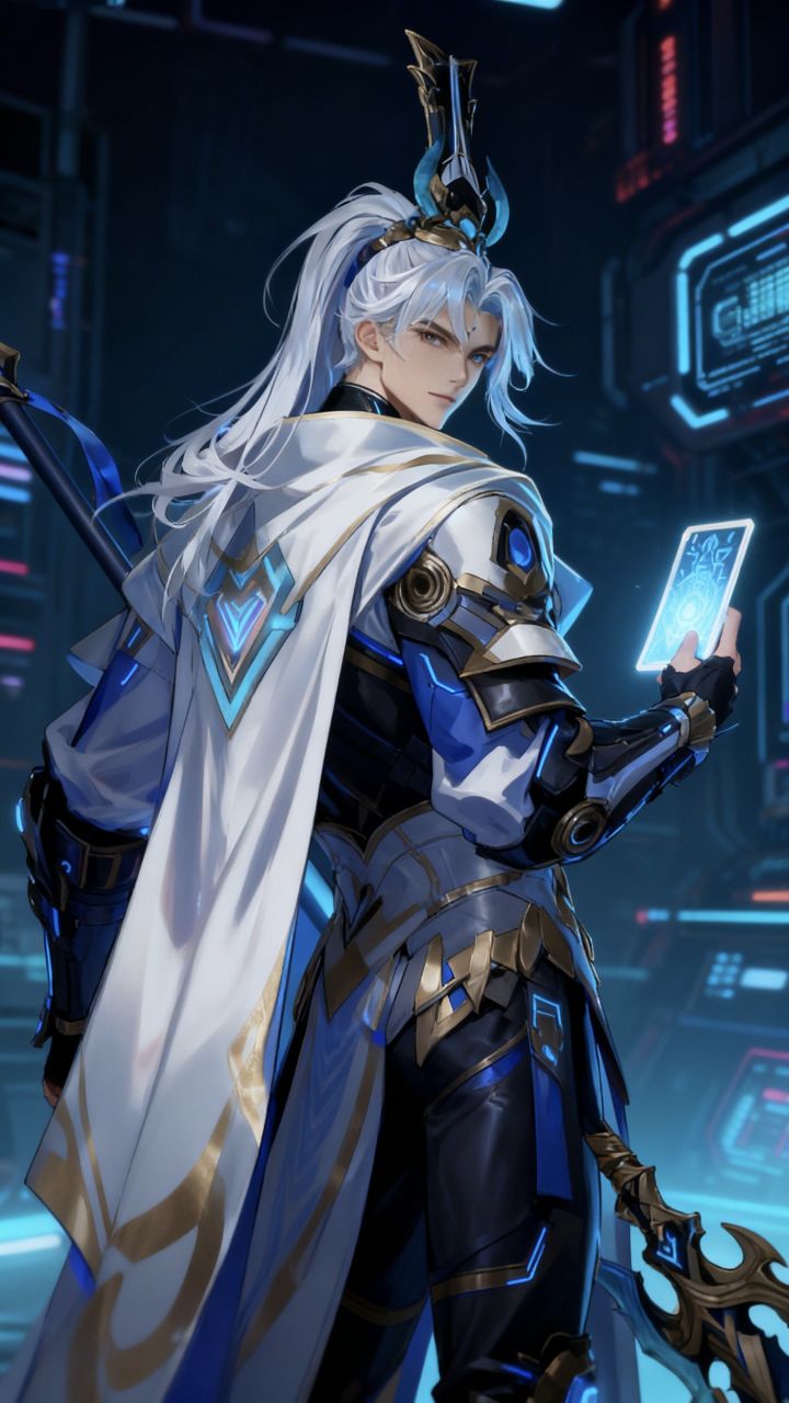 天门将军是防线的最后壁垒:他的白袍是纳米复合装甲,金纹是能量导流回路,手持的星枢令既是上古形制的调兵符,也是防线中枢的权限密钥。此刻他指尖触向令符,蓝光里流转着防线17座要塞的实时数据,身后赛博化的“新南天门”空间站霓虹如战旗。