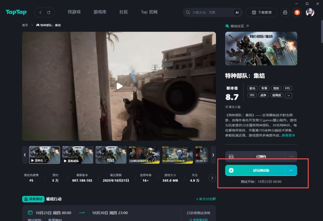 登录TapTap平台客户端,进入《特种部队:集结》商店详情页,找到本次“试玩测试版”按钮,下载游戏客户端