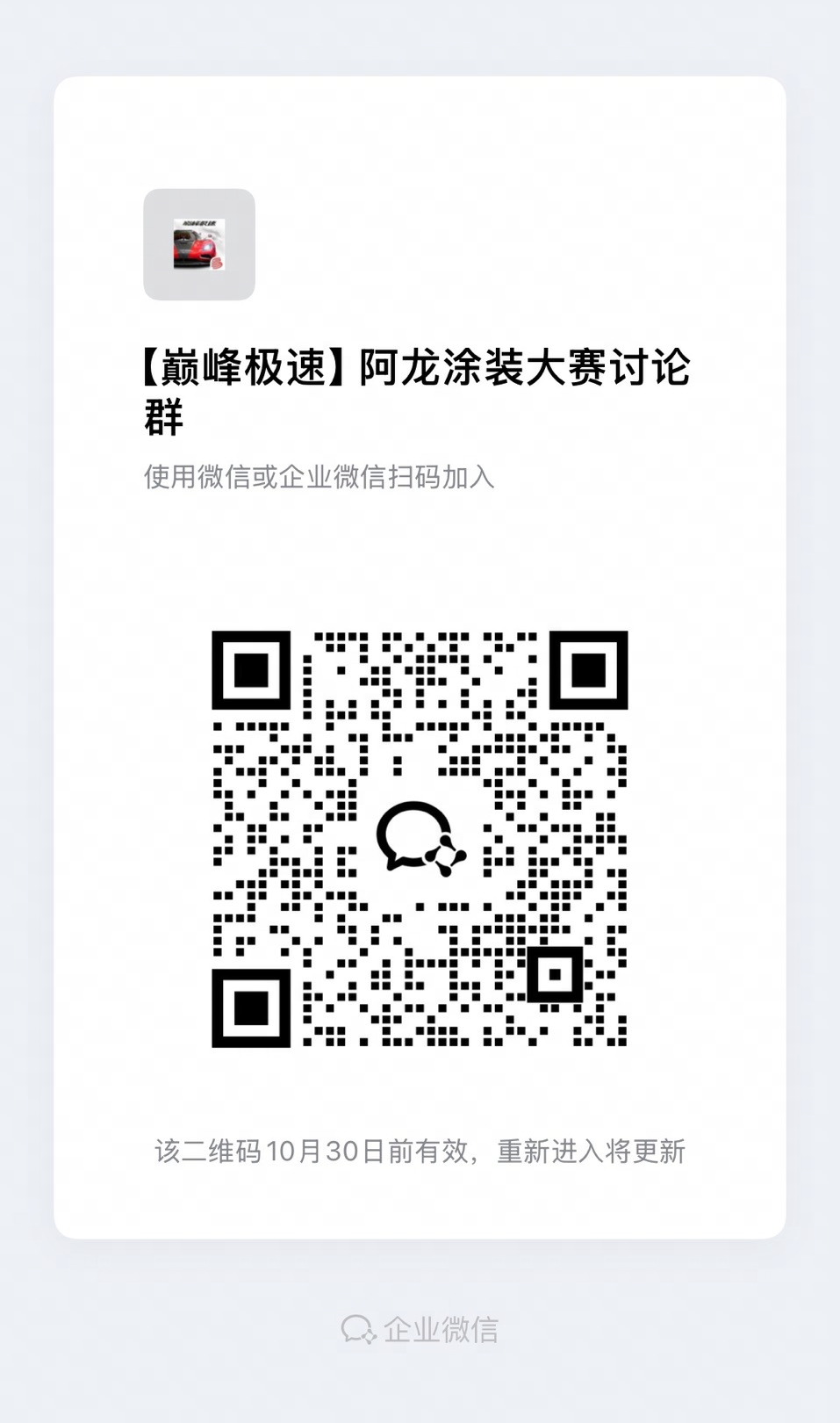 还想了解更多关于比赛的信息?速速扫码加入「阿龙杯活动群」!阿龙本尊也会在群里,关于比赛的任何问题,都可以在群里直接问,还能蹲守第一手消息,和众多涂装大神交流灵感噢~