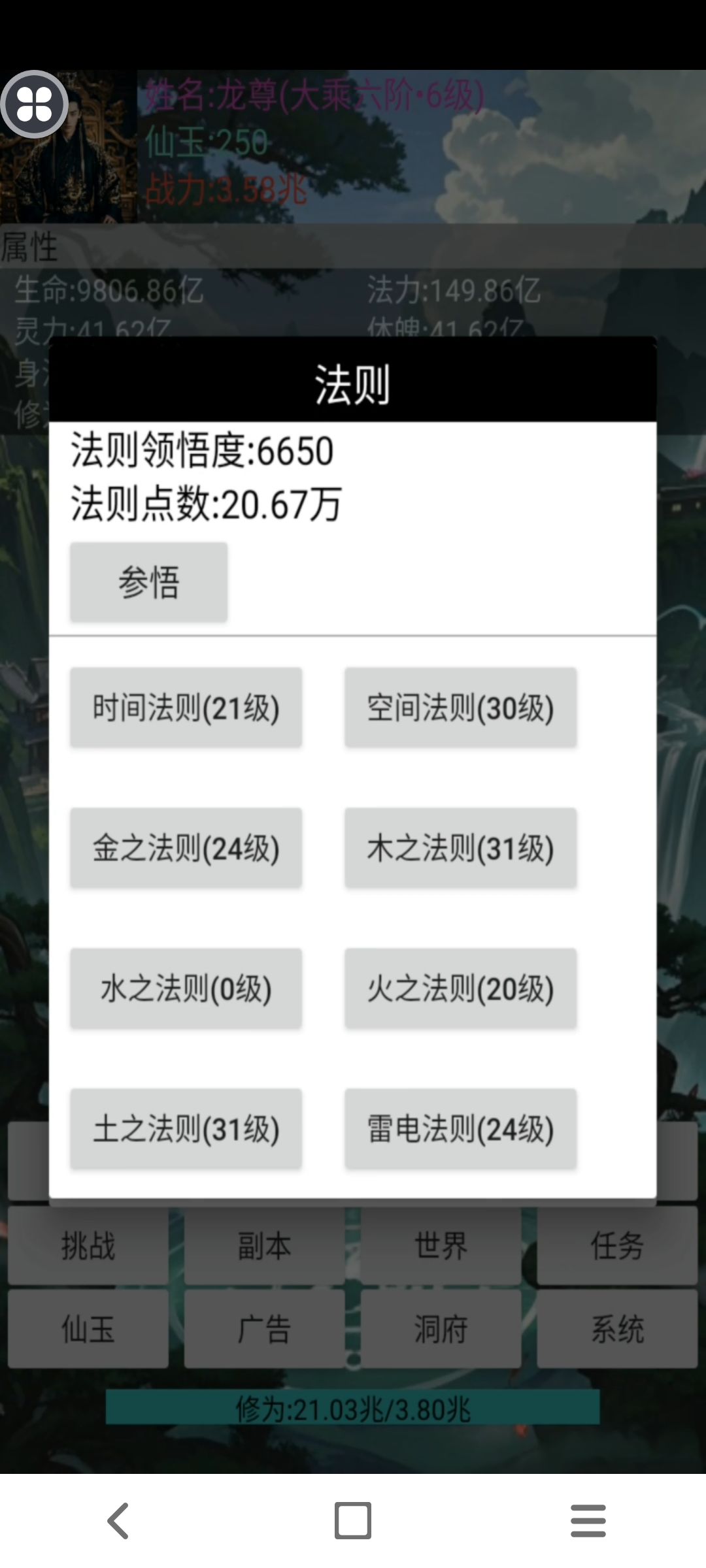合体期有条件也可以直接越阶打 但是合体期领出法则比较亏 建议合体期法则领悟度到660然后存时间突破到大乘再用 切记 优先拉防御跟生命法则!