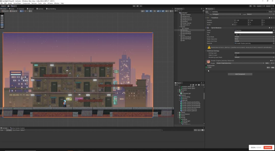 中景建筑不仅用于视觉遮挡,也承担了场景叙事的功能。我们通过模块化的瓦片地图来组合建筑,让它们可以在不同地图中灵活复用。虽然在摆放过程中遇到了一些对齐上的小挑战,但通过调整锚点设置,最终实现了与场景网格的自然融合。
