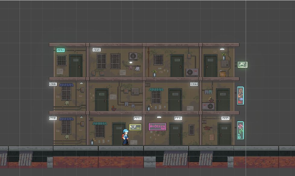 在最近的开发中,我们花了不少心思在背景美术的构建上。我们希望背景不仅仅是“一张图”,而是能随着玩家的移动,带来沉浸感和情绪流动的视觉体验。在这个过程中,我们尝试用分层的方式来构建背景:从最远方的天空与星群,到中景的建筑群,每一层都有其独特的功能与视觉语言。
