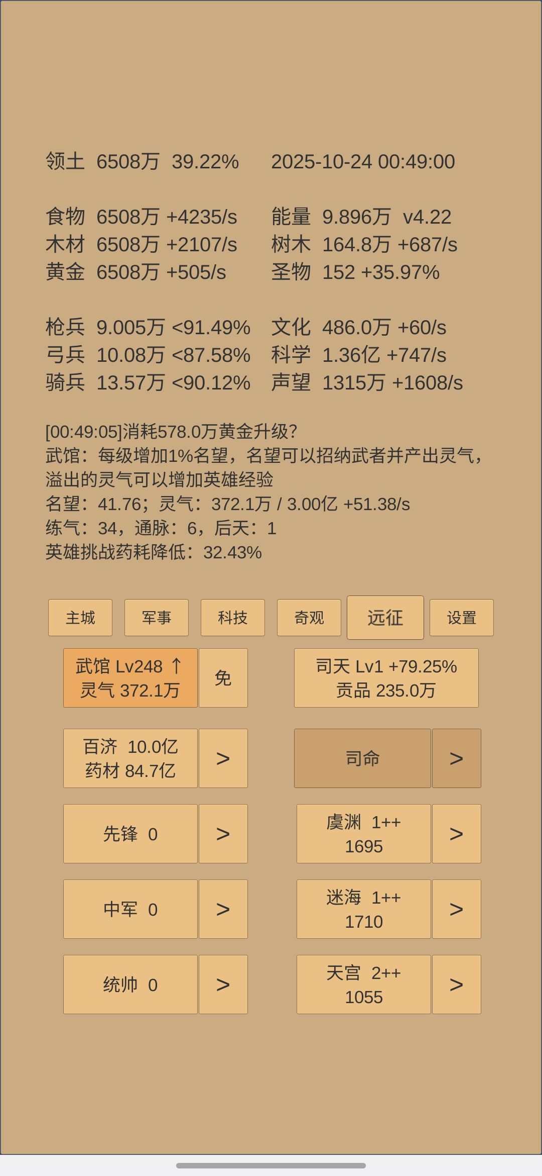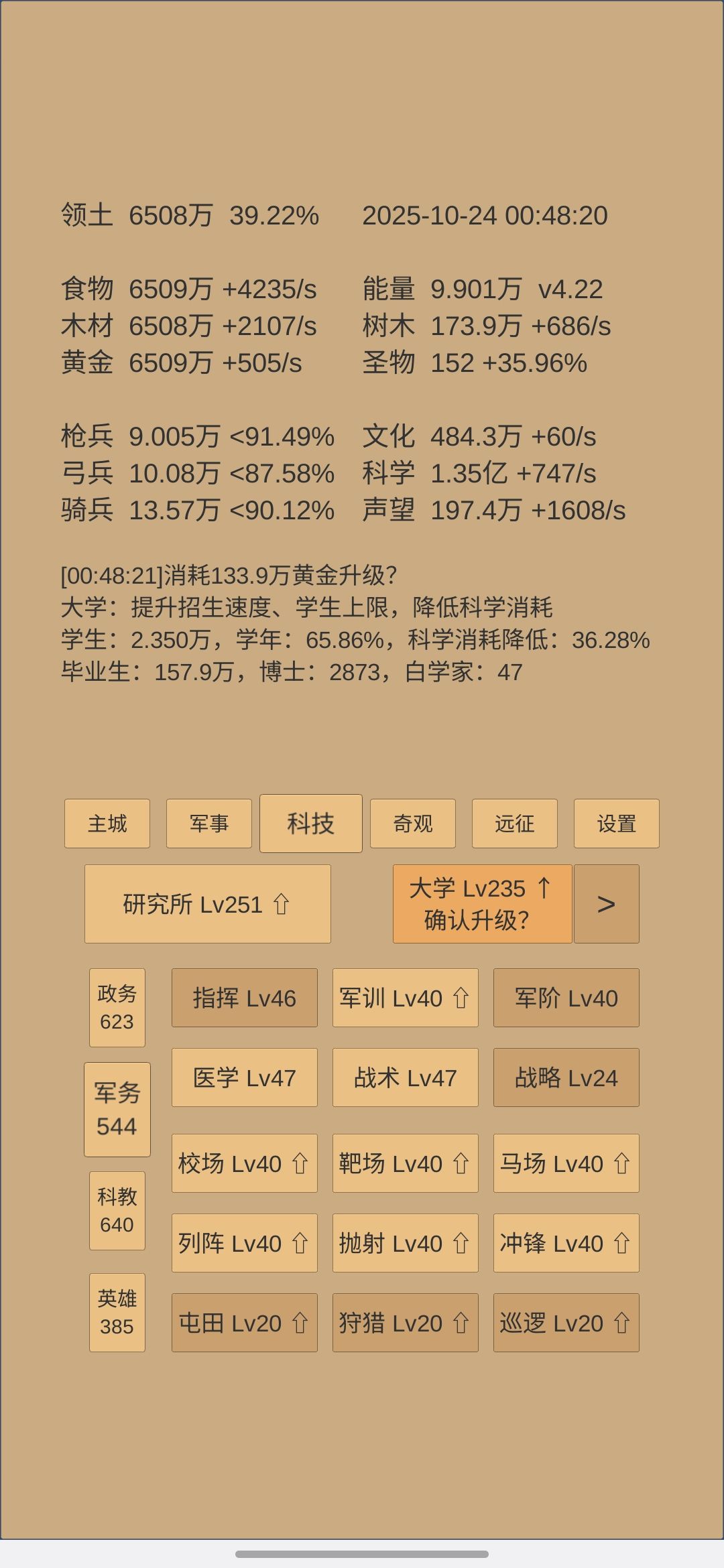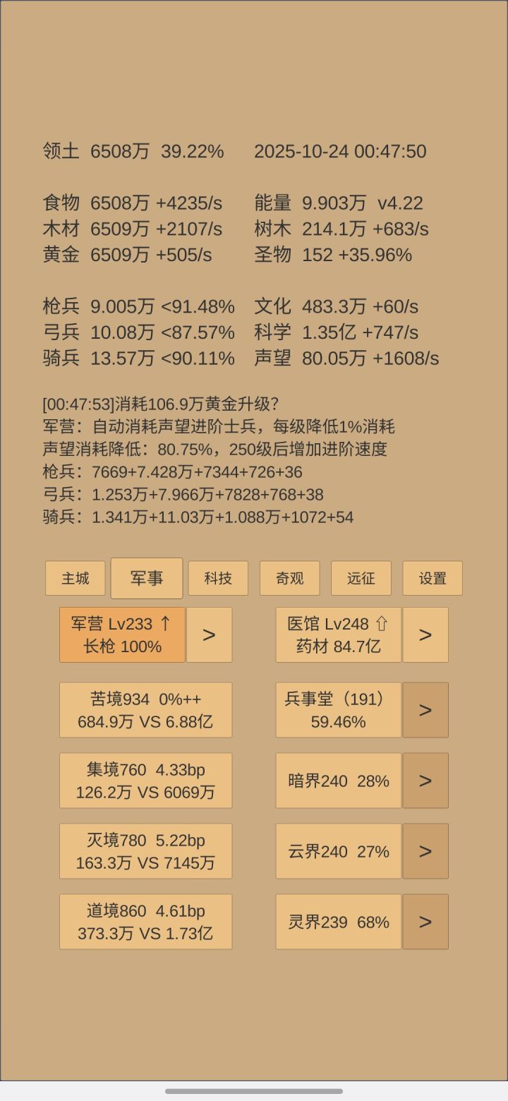 文化破60了,科学家攒到2个了,金字塔8级了,以后就是慢慢熬了,给自己设个目标,先把艺术满级,减少文化消耗,然后继续升英雄,升完搞八个科技出学者,后期加文化?