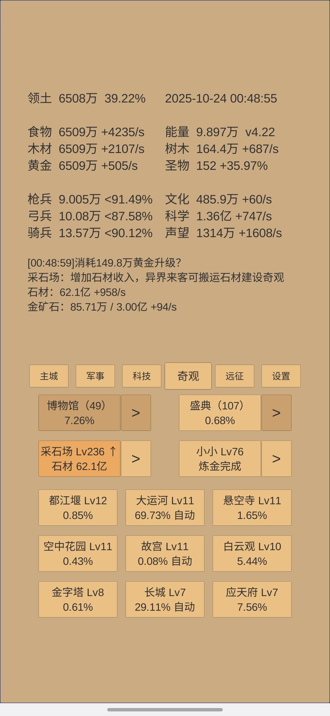盛典后面打算开关时间相等,给科技用,具体表现是升一级博物馆就升四级文化,真希望下次更新可以搞配比,不用手动切了,这样我好两个一直对半开
