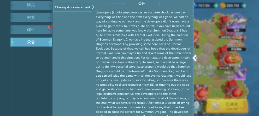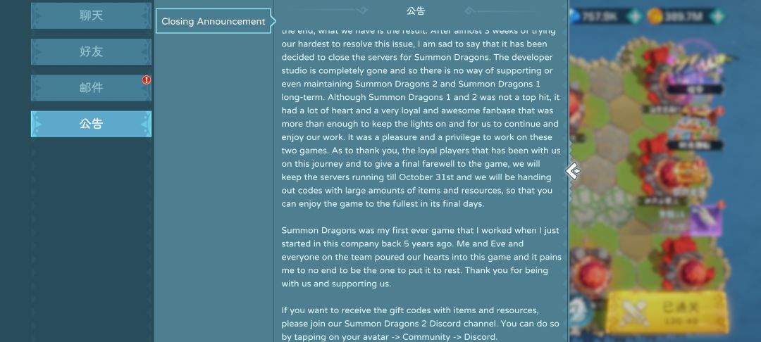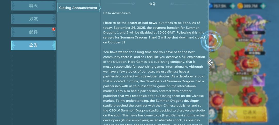 遇见龙2国际服在2025.9.26宣布将在10.31停服,原因是工作室解散导致无法维持服务器,这个令人震惊的消息,既在我意料之外,也在意料之中。因为,一个只靠氪金才能去涨战力的小众游戏,结局注定是关服。