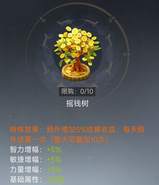 【摇钱树】最多买10个,建议优先买,前期快速获取资源