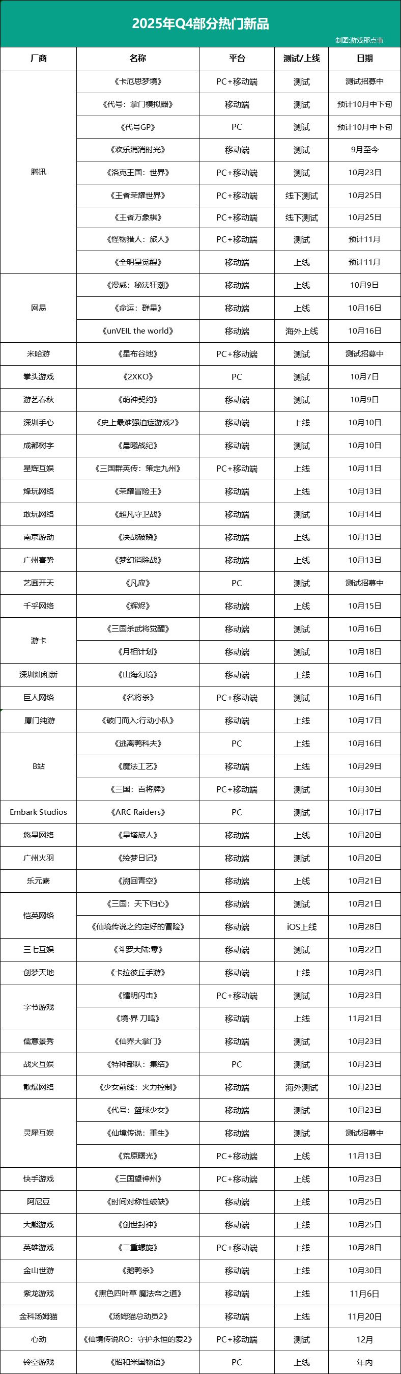 据游戏那点事统计,今年剩余的时间里至少还有40家厂商和57款备受关注的新作打响收官战。除了腾网米“三巨头”,包括灵犀互娱、B站游戏、英雄游戏、创梦天地在内的多家厂商也纷纷亮出手牌,在Q4这个承前启后的关键窗口期集中发力,试图在年度最后的冲刺阶段抢占一席之地。