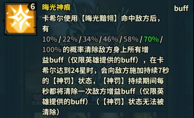 卡希尔使用【晦光黯翎】命中敌方后,有10%/22%/34%/46%/58%/70%/100%的概率清除敌方身上所有增益buff (仅限英雄提供的buff) ,在卡希尔达到24星时,会向敌方施加持续7秒的【神罚】状态,【神罚】持续期间每秒都将清除一次敌方增益buff(仅限英雄提供的buff)(【神罚】状态无法被