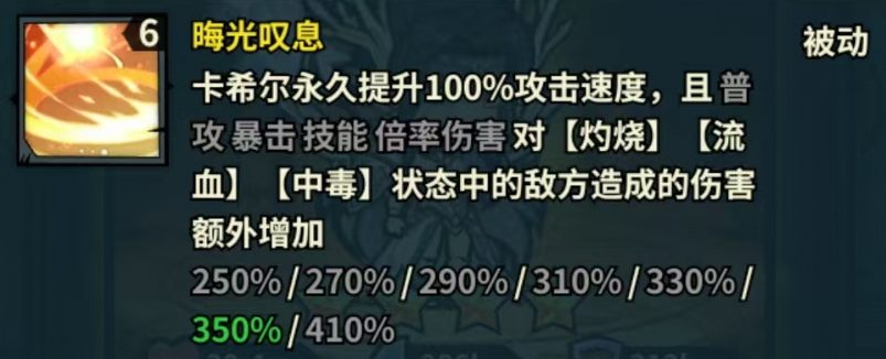 卡希尔永久提升100%攻击速度,且普攻 暴击 技能倍率伤害对【灼烧】【流血】【中毒】状态中的敌方造成的伤害额外增加250%/270%/290%/310%/330%/350%/410%