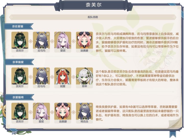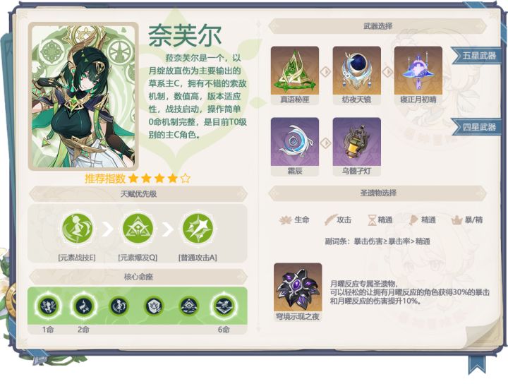 1、奈芙尔抽取建议:0命奈芙尔数值足够,打深渊12层绰绰有余,0+1就是t0级别的主C了,打危战5够用,不过有菈乌玛才是完全体,如果没有菈乌玛的话总伤害会差很多,后面需要补。已有菈乌玛的玩家非常推荐抽取,可以立刻成型满辉的月曜体系