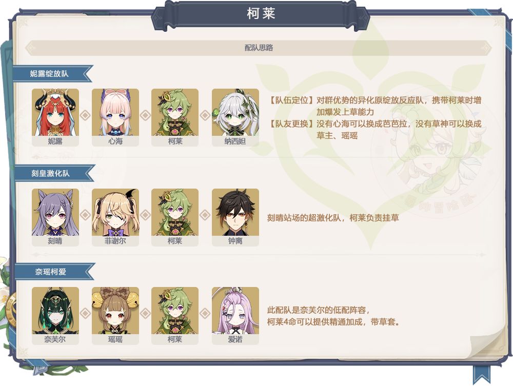 3、柯莱抽取建议:低配草神,白送过好几次的角色,不需要特意去捞命座,而且泛用性一般,后期除了在幻想剧诗里凑数,基本是不用的