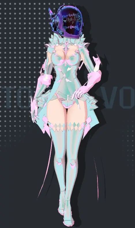 泥巴(不太正式的评委版):该作品以头盔"波频视域”为核心元素,对《无头骑士异闻录》主题进行了极具巧思的视觉转译,非常大胆地摒弃了爱尔·斯宾塞引以为傲的容貌,将全部张力聚焦于爱尔佩戴头盔后的瞬间,同时对于爱尔身体部分的色彩使用了华彩染料。整个作品巧妙地玩味了“无头”“有头”的哲学概念,营造出强烈的神秘感和视觉冲击,构建了一个充满故事性的瞬间。