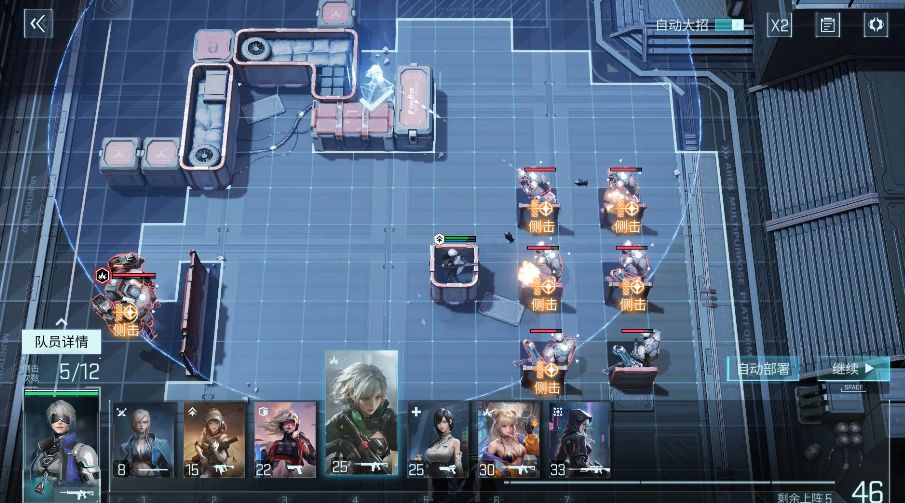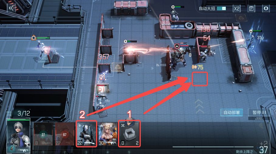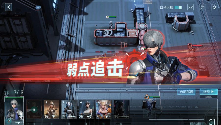 还需要注意,下方小兵清除完毕后,自动部署会优先在两个“X”的位置上阵队员,但这两个位置无法消除boss弱点,要微操一下,推荐在图示位置或者在其他可侧击处放置掩体上阵角色~