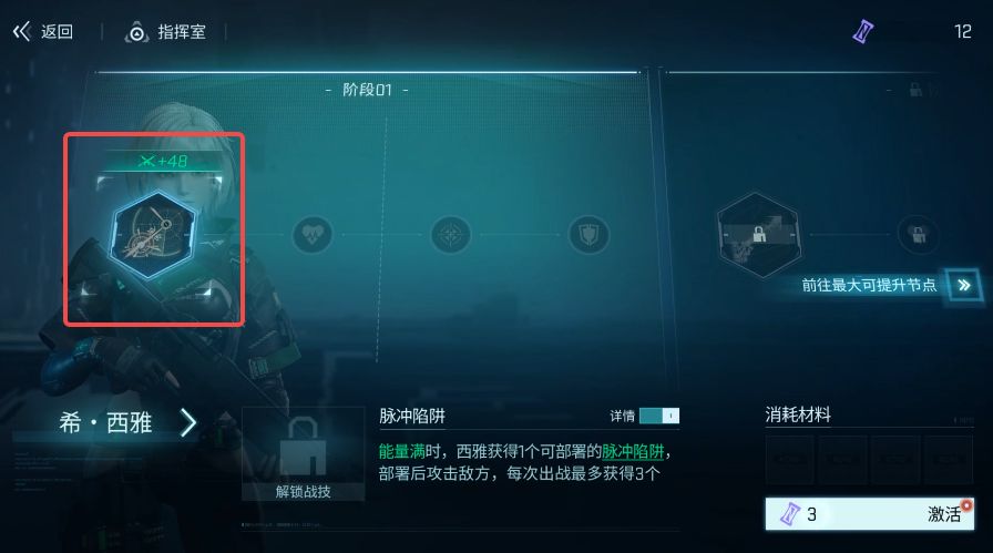 - 完成4个以上队员的第一阶段突破(优先突击/重盾/火力),完成3个以上角色的第一个战术专精激活(下图红框内),激活后先不用额外激活后面的属性,完成所有队员第一个专精战技解锁后,再激活后续的效果(优先突击/重盾/火力队员)