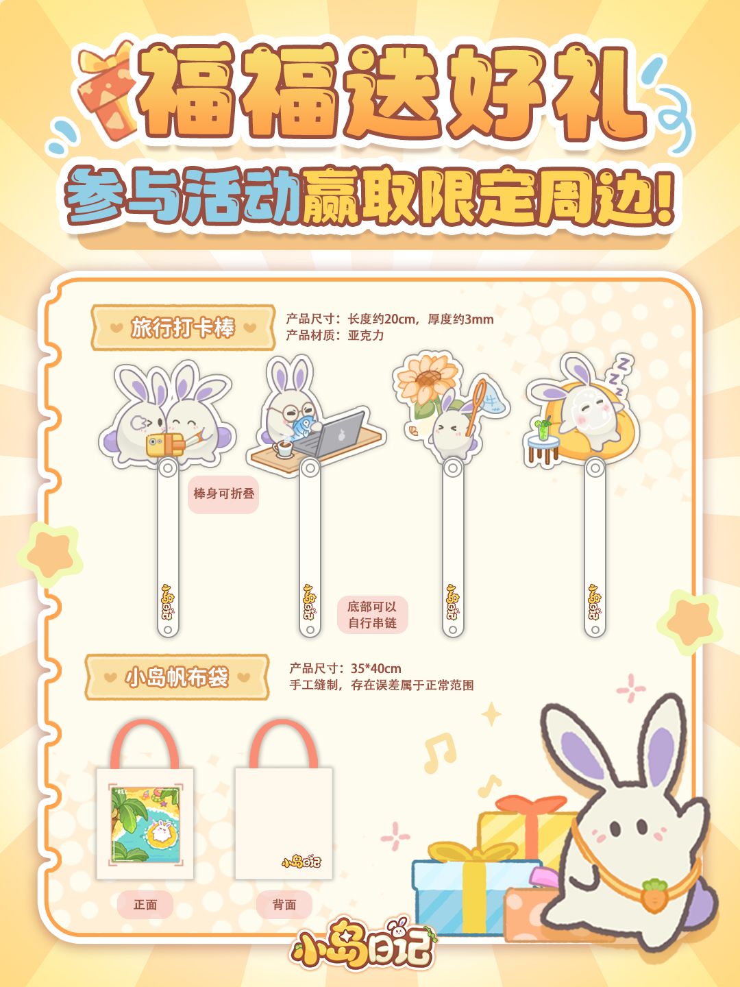 我们将于11月10日在满足条件的岛民中,抽5位岛民送出限定周边【小岛帆布袋】,另抽5位送出【旅行打卡棒】!