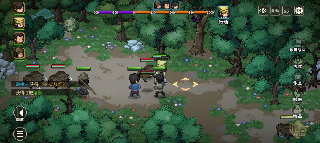 这里我们让说书人最少拿一个人头,洪小七速度快,看看能不能在山贼手下抢一个人头。 打完以后山贼不敢偷袭了,因为这次我们人多,他怂了,