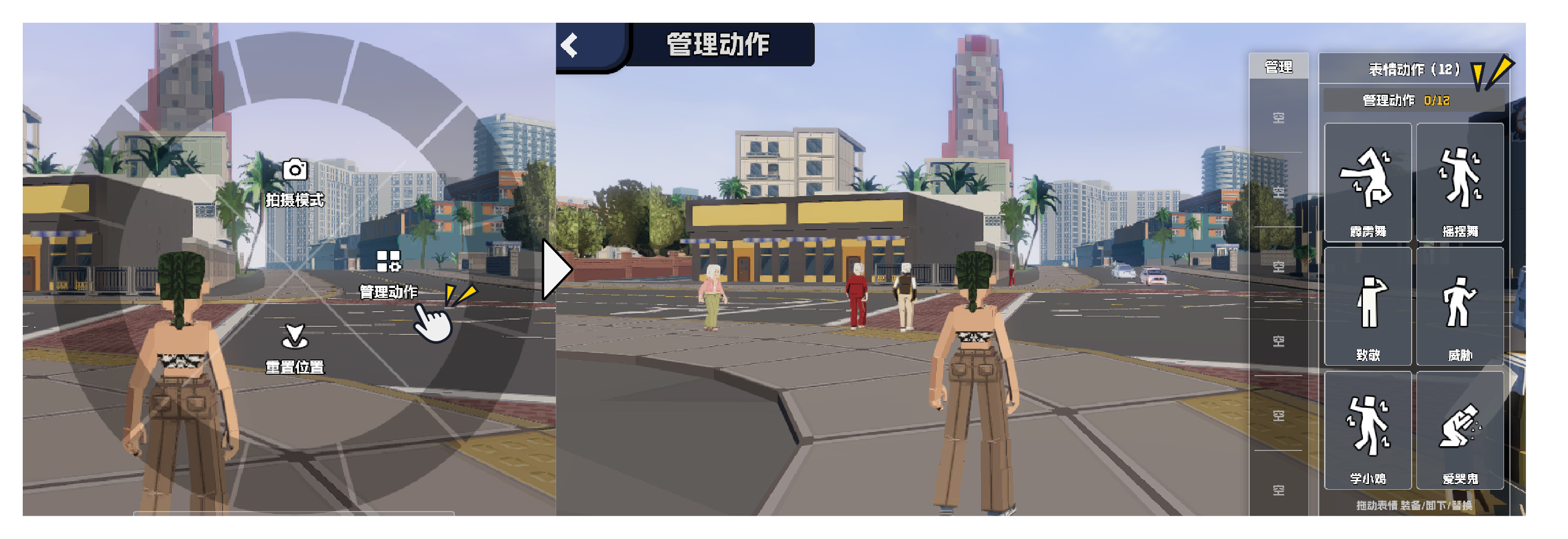 默认的表情动作用着不得劲?别担心!在【表情动作轮盘】中,我们增加了【管理动作】按钮。进入【管理动作界面】,您现在可在轮盘中自由搭配心仪的表情动作。