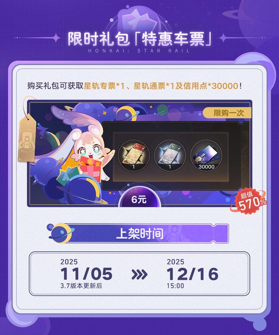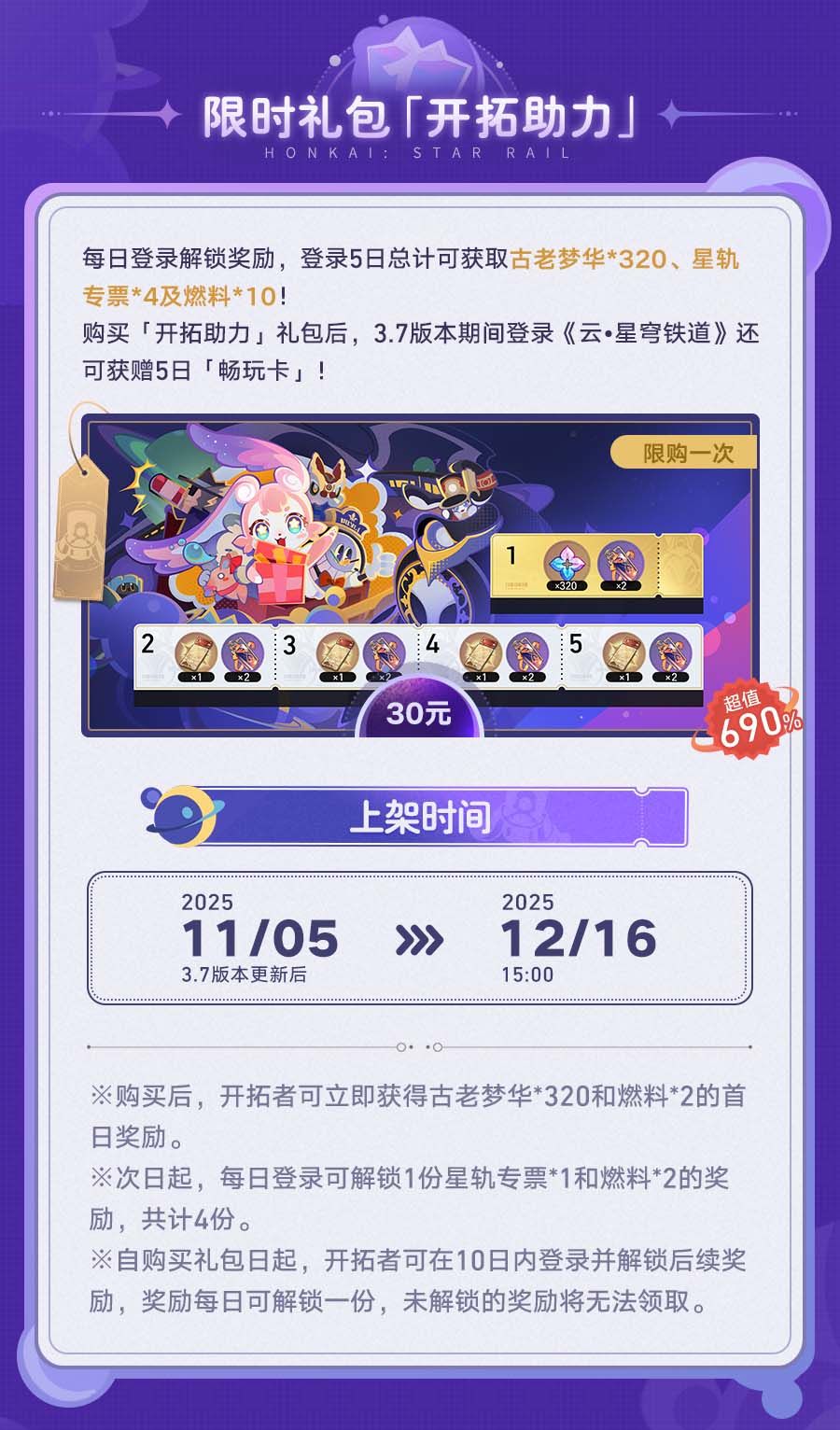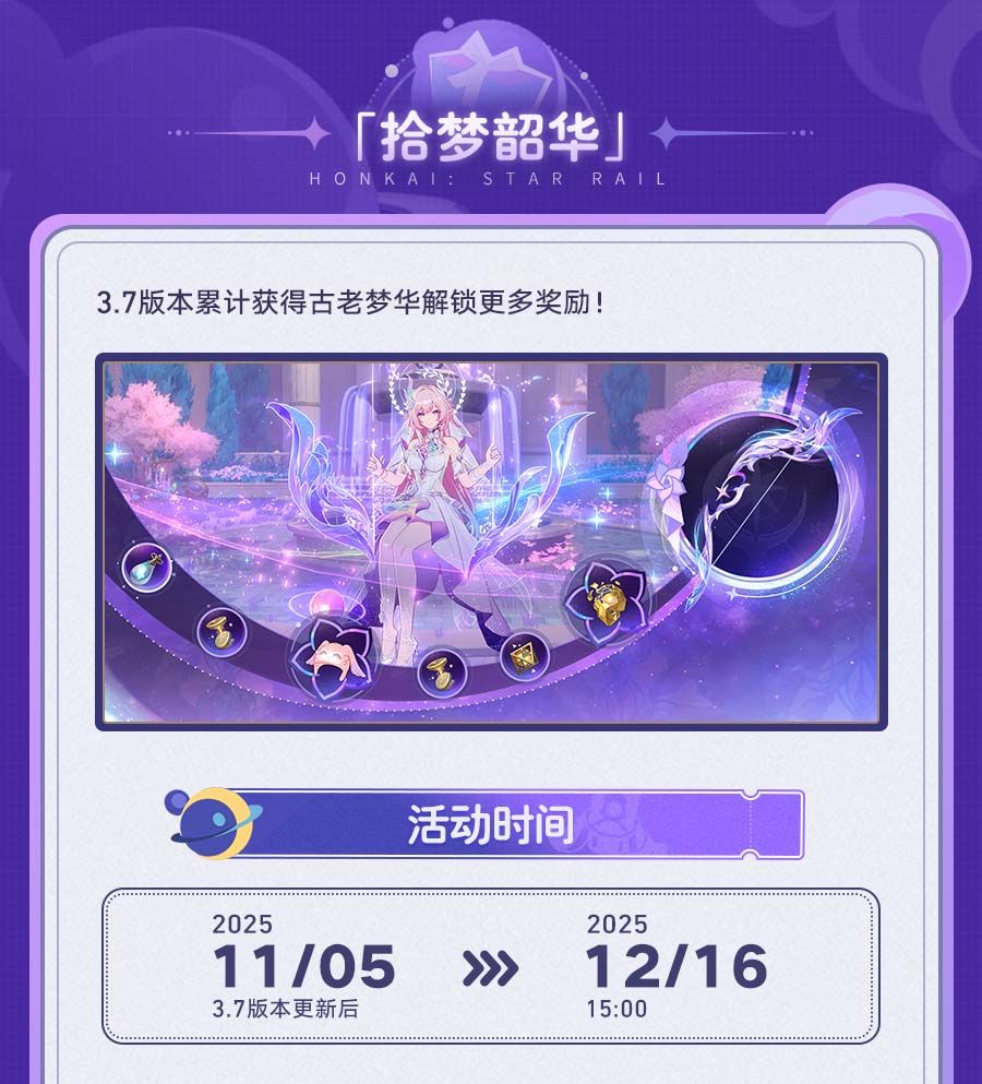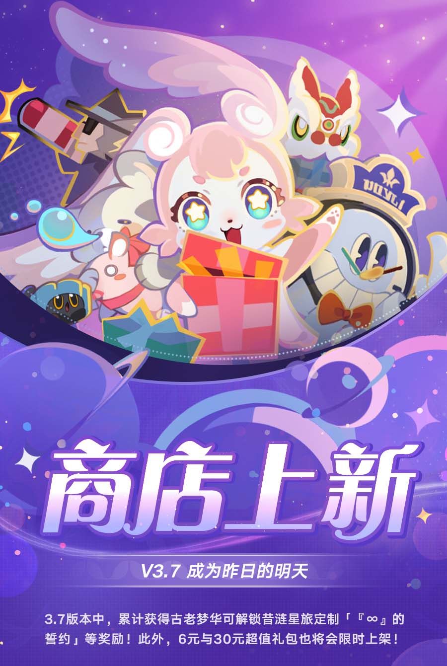 3.7版本中,累计获得古老梦华可解锁昔涟星旅定制「『∞』的誓约」等奖励!此外,6元与30元超值礼包也将会限时上架!