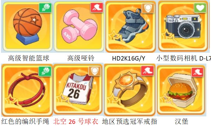 大前锋器材:高级智能篮球(勾手精通)高级哑铃(消耗下降、扣篮精通)HD2K16G/Y(主练,瞬速抢断)小型数码相机D-L7(训练加成、背打精通)